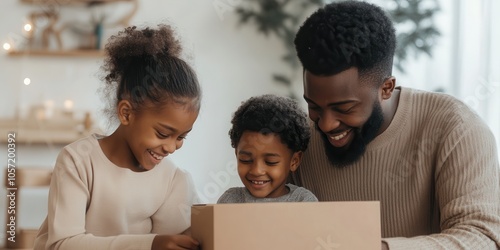 A joyful family moment as a father shares a gift with his two excited children at home.