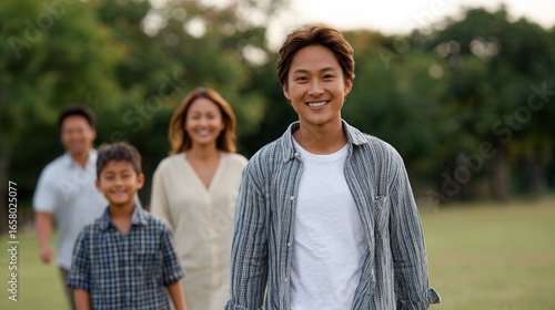 A joyful family of four walking together in a park, enjoying quality time outdoors. The scene captures a warm and cheerful atmosphere.