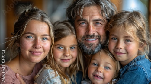 A joyful family poses closely together with smiles in a cozy indoor setting during bright daylight