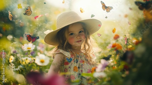 A Joyful Girl in a Flower Field with Butterflies Dancing Around Her