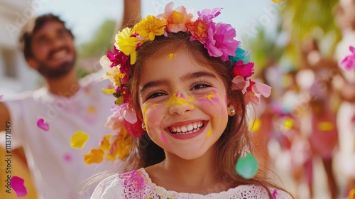 A joyful girl with flowers in her hair smiles amidst a festive celebration.