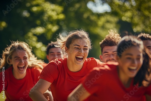 A joyful group of friends enjoying a fun moment outdoors. They are all wearing bright red shirts and laughing. This captures the essence of friendship and happiness. Generative AI