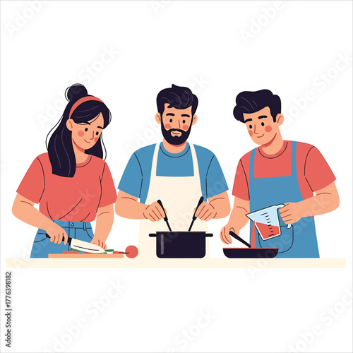 A joyful group of friends or family members collaboratively engaging in a fun cooking session, sharing culinary passion and preparing a delightful meal together in a modern kitchen setting
