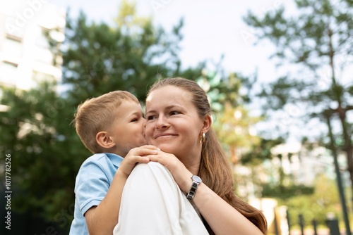A joyful moment between a mother and son sharing affection in a bright park on a sunny day