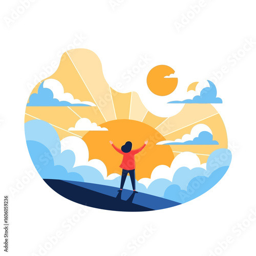A joyful person with arms raised stands on a mountaintop, greeting the bright morning sunrise above the clouds.