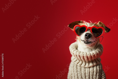 A joyful pup in a chunky white sweater and playful heart glasses poses against a bright red background