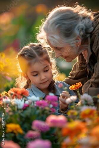 A joyful scene of a girl and grandmother exploring a vibrant flower garden together.