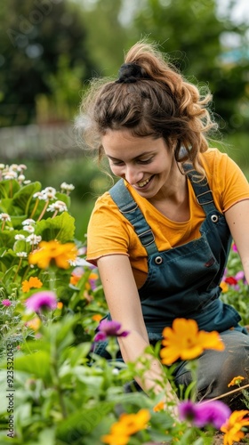 A joyful woman cultivates colorful flowers in a lush garden on a bright summer day