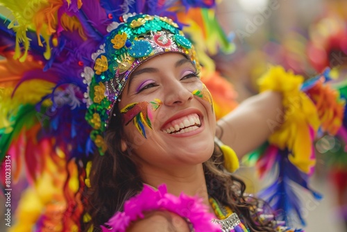 A joyful woman dancing in a vibrant street parade, surrounded by colorful costumes and decorations, the street softly blurred
