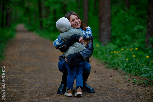A joyful woman hugs a child on a forest path, sharing a heartfelt moment in nature. Surrounded by greenery and trees, they express love, warmth, and connection in an outdoor setting.