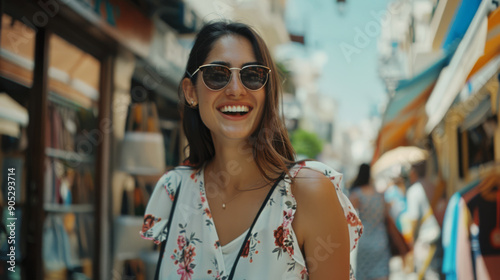 A joyful woman in sunglasses and a floral dress enjoys a sunny day in a bustling European street market.