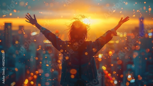A joyful woman with arms raised, smiling against a backdrop of a futuristic cityscape, symbolizing hope and excitement for the future. Generative AI.