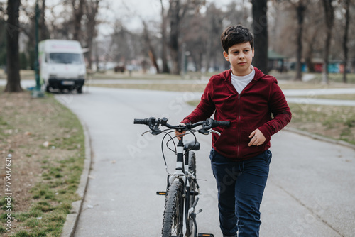 A joyful young boy takes a break from riding to walk with his bicycle alongside a path in a tranquil park setting.