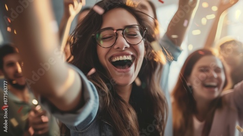 A joyful young woman with glasses laughs and celebrates with confetti and friends at a lively party.