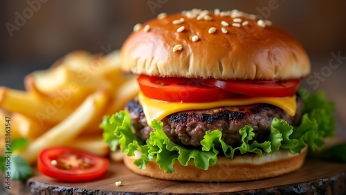 A juicy cheeseburger topped with fresh lettuce and tomato, served on a golden bun. The vibrant colors and mouthwatering ingredients make it a classic choice for any fast food or dining design.