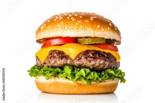 A juicy cheeseburger with lettuce, tomato, pickles, and melted cheddar cheese in a sesame seed bun.