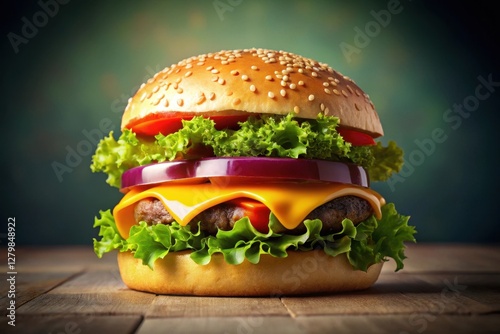 A Juicy Cheeseburger with Sesame Seed Bun, Melted Cheese, and Fresh Lettuce on a Rustic Wooden Table