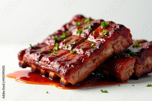 A juicy stack of BBQ ribs, glistening with sauce, sits on a pristine white background , fatty, photography