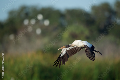 A juvenile Wood Stork flies in front of green grasses and trees in the bright sunlight.