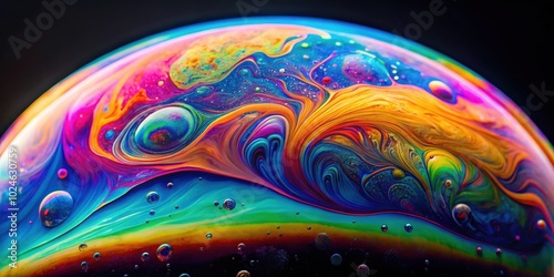 A kaleidoscope of colors and patterns dance across the surface of a soap bubble, creating an abstract masterpiece of vibrant hues and swirling lines.
