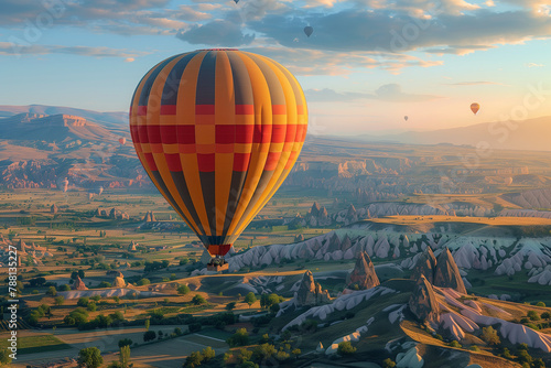 A kaleidoscopic hot air balloon hovers over Cappadocias distinctive rock formations bathed in soft dawn light