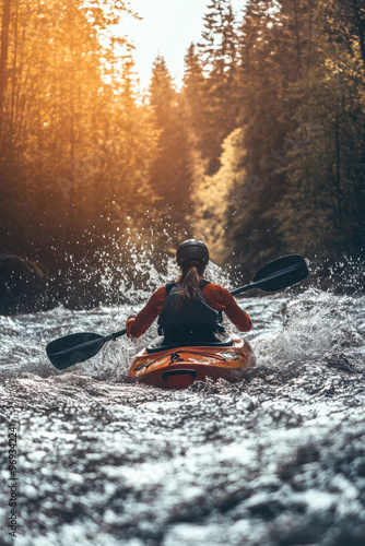 A kayaker rafting struggling with water splashes in boat in rapid river in mountain
