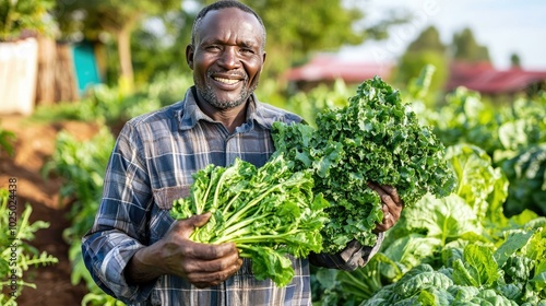 A Kenyan farmer proudly holds freshly picked green vegetables in front of his small farm, showcasing sustainable agriculture practices and the importance of local farming in the community.