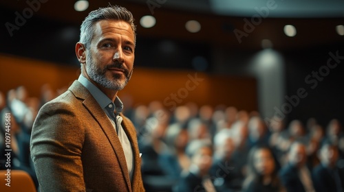 A keynote speaker addressing a large audience, inspirational speech, motivational message, leadership