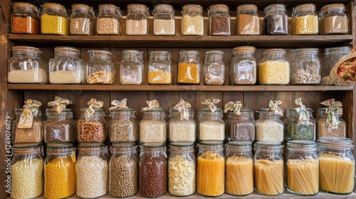A kitchen shelf with neatly arranged glass jars of pasta, grains, and spices