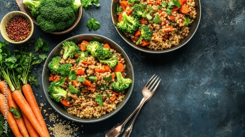 A kitchen table set with bowls of broccoli, carrots, and rice, alongside a savory Quinoa Broccoli Carrot Curry, offering a wholesome and colorful meal.