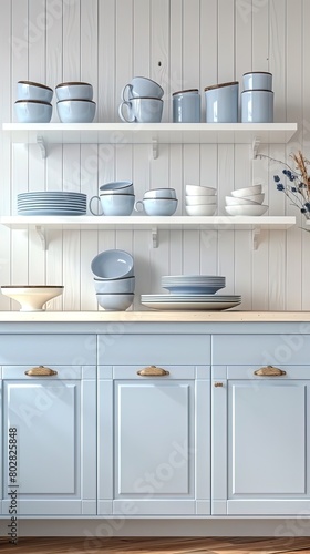 A kitchen wall with light blue cabinets and white vertical paneling, shelf for displaying dishes.