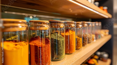 A kitchen with a walk-in pantry showcasing neatly stacked glass jars filled with colorful spices