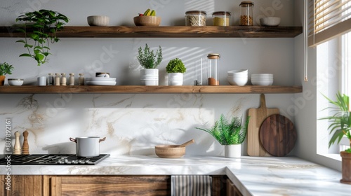 A kitchen with a white countertop and wooden shelves