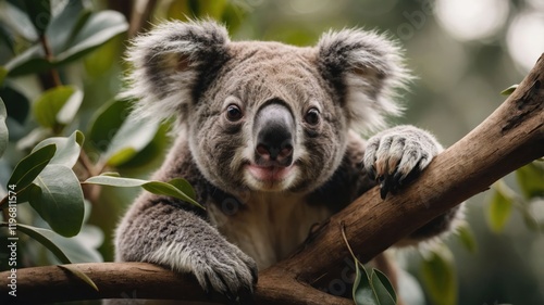 A koala perched on a branch, surrounded by green leaves, showcasing its playful demeanor.