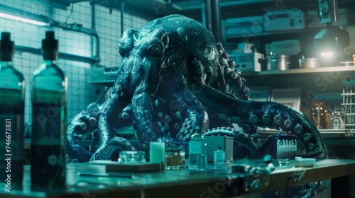 A kraken in an ocean-based laboratory, assisting in genetic coding research, merging deep sea mythology with genetic advancements