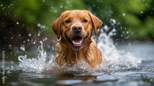 A Labrador splashing in a sparkling pond, exuding pure happiness on a hot summer day