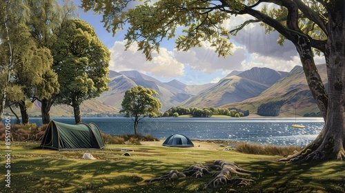 a lakeside camping experience, two tents are situated on vibrant green grass under trees, providing a stunning vista of a tranquil lake, grand mountains, and sun rays casting a magical light.