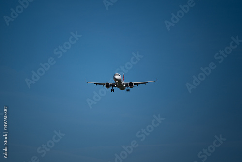 A landing commercial airplane set against blue sky background. Looking up, close up telephoto shot