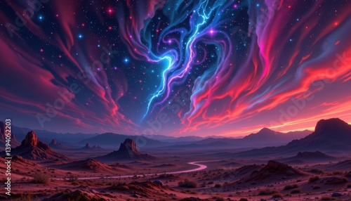 A landscape on an alien planet with a vivid sky filled with colorful nebulae and stars.