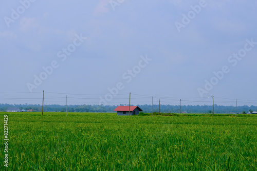 A landscape picture of paddy field in Sekinchan with house and electric pole insight.