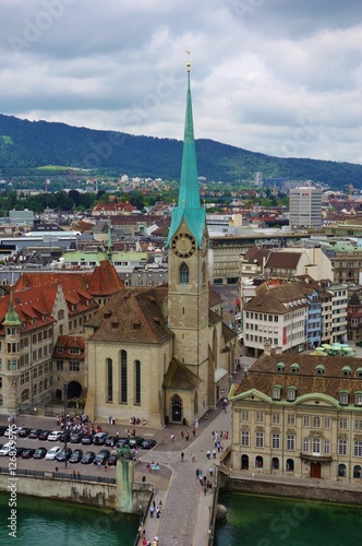 A landscape view of Zurich on the Limmat River and the Lake Zurich