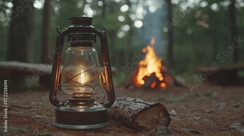 A lantern illuminates a campsite with a crackling fire in a serene forest setting.