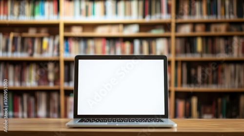 A Laptop Computer with a Blank Screen in Front of a Bookshelf