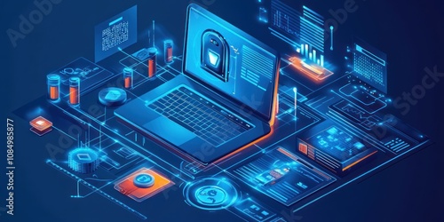 A laptop connected to other devices, data, and an internet network.