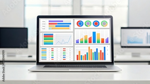 A laptop displaying colorful graphs and charts on a desk, highlighting data analysis and business intelligence in a modern office environment.