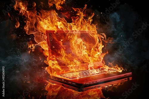 A laptop engulfed in flames in a dark setting. Suitable for illustrating cybersecurity threats
