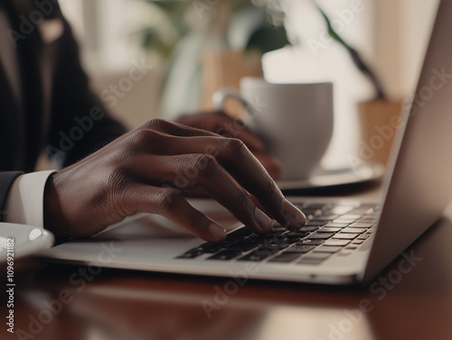 A laptop in use, with a coffee cup nearby on a clean desk, bright and minimalistic workspace