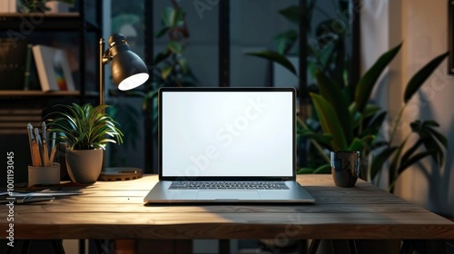 A laptop is sitting on a wooden desk with a potted plant in front of it