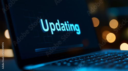 A laptop screen shows an update progress text in a bokeh illuminated setting. Symbolizing technology, updates, and innovation for digital and professional themes.