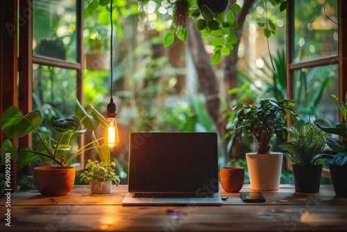 A laptop sits on a desk next to a potted plant